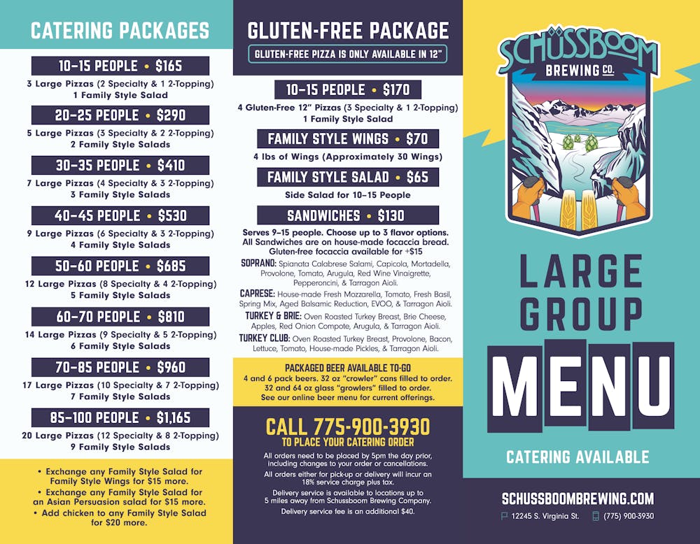 Schussboom Brewing Company now offers catering for office/staff luncheons or large parties and gatherings. We make ordering handmade pizzas, sandwiches, salads, wings, or dessert platters easy for you!